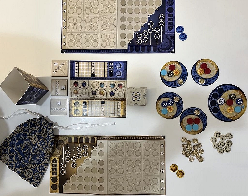 A dobozt kinyitva az Azul-családból már ismerős dolgok néznek vissza ránk: manufaktúrakorongok, csempék, pontszámjelzők, játékostáblák, pontozótábla, húzózsák, torony. De mik ezek a kupolalapkák, bónuszkorongok és céllapkák? Miben különbözik a nagy manufaktúra a kicsiktől? Mit jelentenek a félholdalak a manufaktúrakorongokon? Miért van négy pontszámjelző, ha az Azul: Párbaj csak ketten játszható? És ha amúgy is játszható minden Azul ketten, akkor miért született meg ez a verzió?