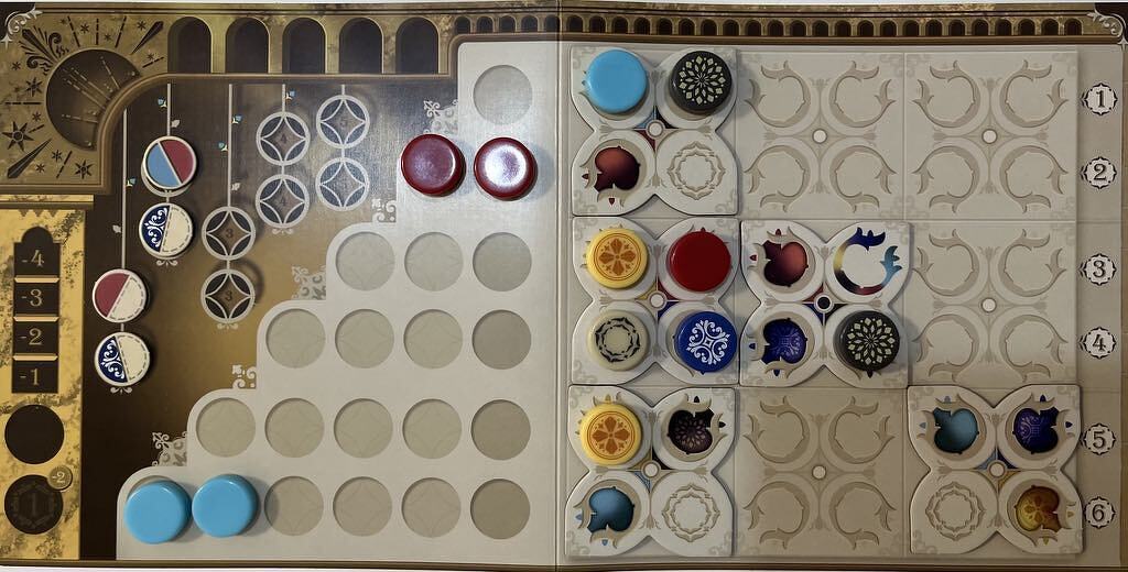 Az Előkészületek fázisban visszavesszük a játékosjelölőinket, feltöltjük a kupolalapka kínálatot ismét háromra, majd csempéket és bónuszkorongokat rakunk a manufaktúrákra.