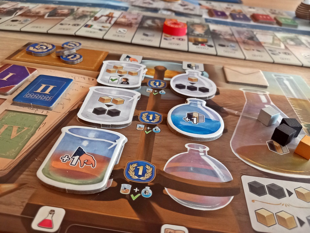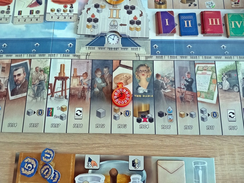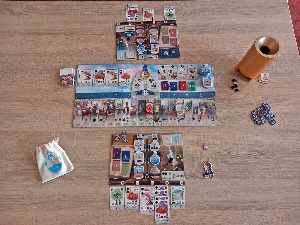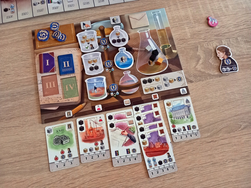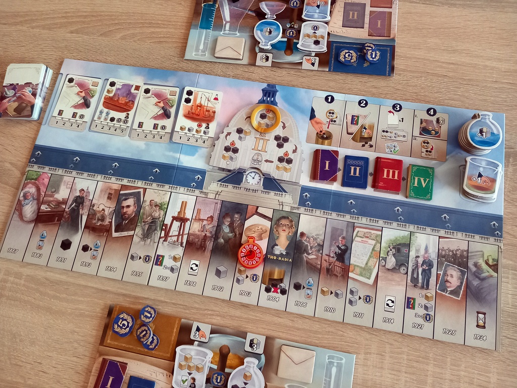 Ki kell emelnünk, hogy ez bizony egy pontszegény játék. Mi általában 10-15 pont között szoktunk végezni. Emiatt szűk tere van a versengésnek, folyamatosan egymás nyakába lihegünk, és mindig nyomon követhető ki hol tart. Tapasztalataink szerint a Marie Curie lapka nagy hatással van a játék végkimenetelére, eddig minden alkalommal az nyert, aki a játék végén birtokolta. Persze lehet, hogy csak nálunk jött ki így a lépés. Ettől kicsit hektikusabb a szerencse szerepe, mert az szinte az egész játékot átszövi. Ráadásul úgy érezzük, hogy nem egyenértékűek bizonyos játékelemek által biztosított előnyök. Például egy szurokércért megkapni a Marie Curie lapkát nem egyenértékű azzal, amikor két rádiumért kapunk két szurokércet.