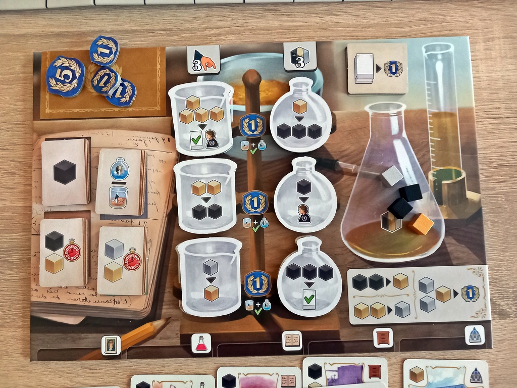 Ez után a begyűjtött erőforrásokat arra használjuk, hogy kártyákat szerezzünk, kísérleteket végezzünk, ezáltal fejlesszük a laborunkat, illetve beválthatjuk győzelmi pontokra.