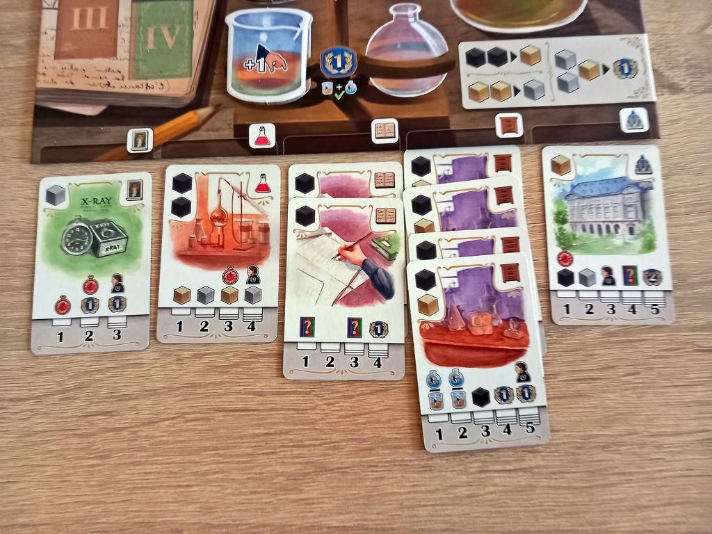 A kártyákból szetteket gyűjtünk és a lapok mennyiségének megfelelően kaphatunk különböző hasznos dolgokat (erőforrást, pontot, kártyát). Ha elég sikeresek vagyunk, akkor felkeltjük Curie professzor érdeklődését, aki segíti a munkánkat. Ezt szimbolizálja a Marie Curie lapka, – amihez bónuszként (kártyák és kísérletek után) juthatunk hozzá a játék folyamán –mellyel egy új kockaváltási lehetőséget kapunk, amivel olcsóbban válthatjuk a rádiumot győzelmi pontokra.