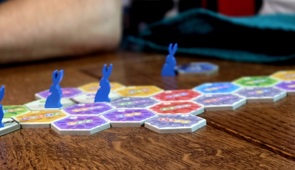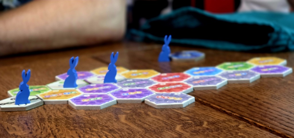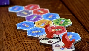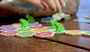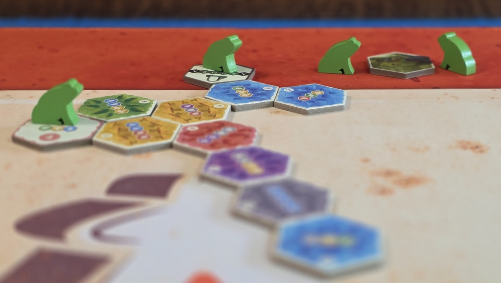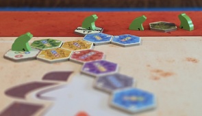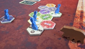 A suttogó rengeteget tavalyi TÜ-n próbáltuk ki, Essenben valahogy elkerülte a figyelmünket, pedig a természet témájú játékokra azért többé-kevesbé oda szoktam figyelni. Tudom, hogy sokaknál inkább már negatív/unalmas a téma, de A suttogó rengeteg kapcsán megnyugtatok mindenkit. A játék teljesen absztrakt. TÜ-n 4 fővel próbáltuk, pontosabban ketten álltunk neki kibogozni a szabályokat és pár kör lejátszása után jött egy pár érdeklődve, hogy milyen, aztán gyors újrakezdés után már négyen játszottuk. Ekkora játékosszámnál már tényleg benne van az amit a cikk is említ. Egyáltalán nem biztos, hogy marad neked megfelelő lapka a kínálatban, ami egy ennyire előretervezős játékban létfontosságú lehet. Szerencsére van lehetőségünk a kínálatot frissíteni, bár ez a játék végén pontba fog kerülni.