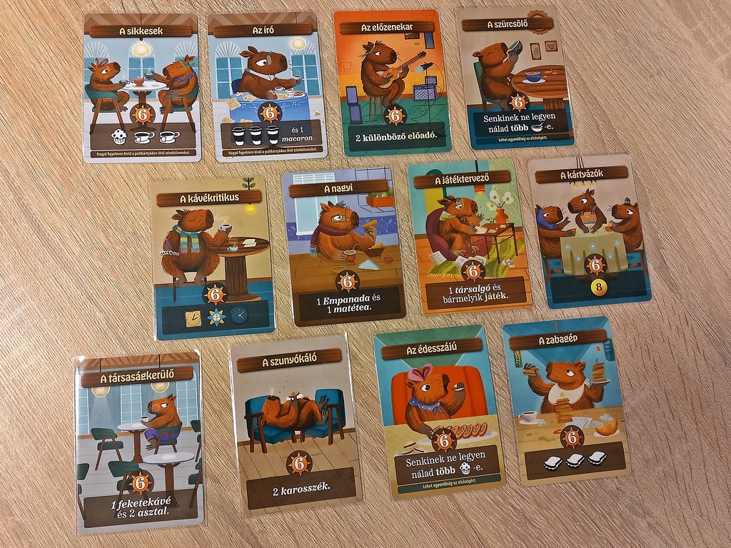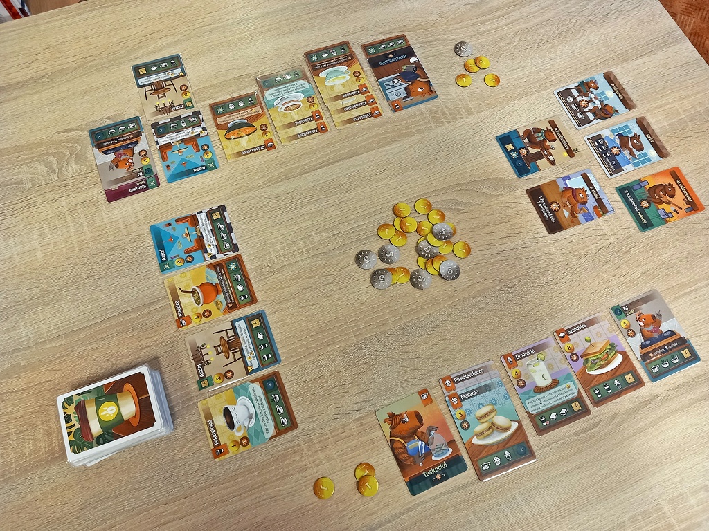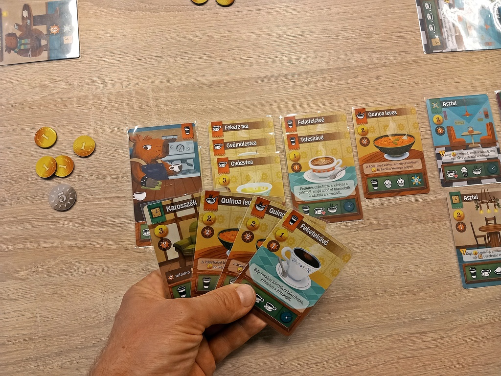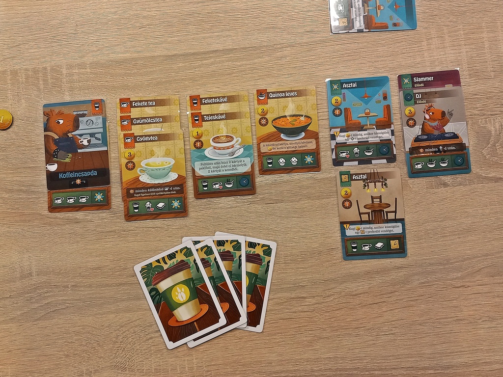 A játékban kávézókártyákat játszunk ki. Ezek multifunkciós kártyák, melyekkel egyrészt a kávézód kínálatát bővítheted, másrészt felszolgálhatod egy vendég rendeléseként. A kártyák továbbá tartalmaznak kijátszási költséget, győzelmi pontot, extra hatást vagy akciót biztosít, illetve a felső részén meghatározza az árutípust vagy díszítőelemet (ilyen lesz a kávéház stílusa). A játék elején felfordítunk öt különleges vendég kártyát. Ezeknek a vendégeknek különleges igényeik vannak, de bárki teljesítheti őket, akárt több játékos is. Ezek mindegyike 6 pontot ér a játék végén, és konkrét kártyákat vagy rendelést kell teljesíteni.