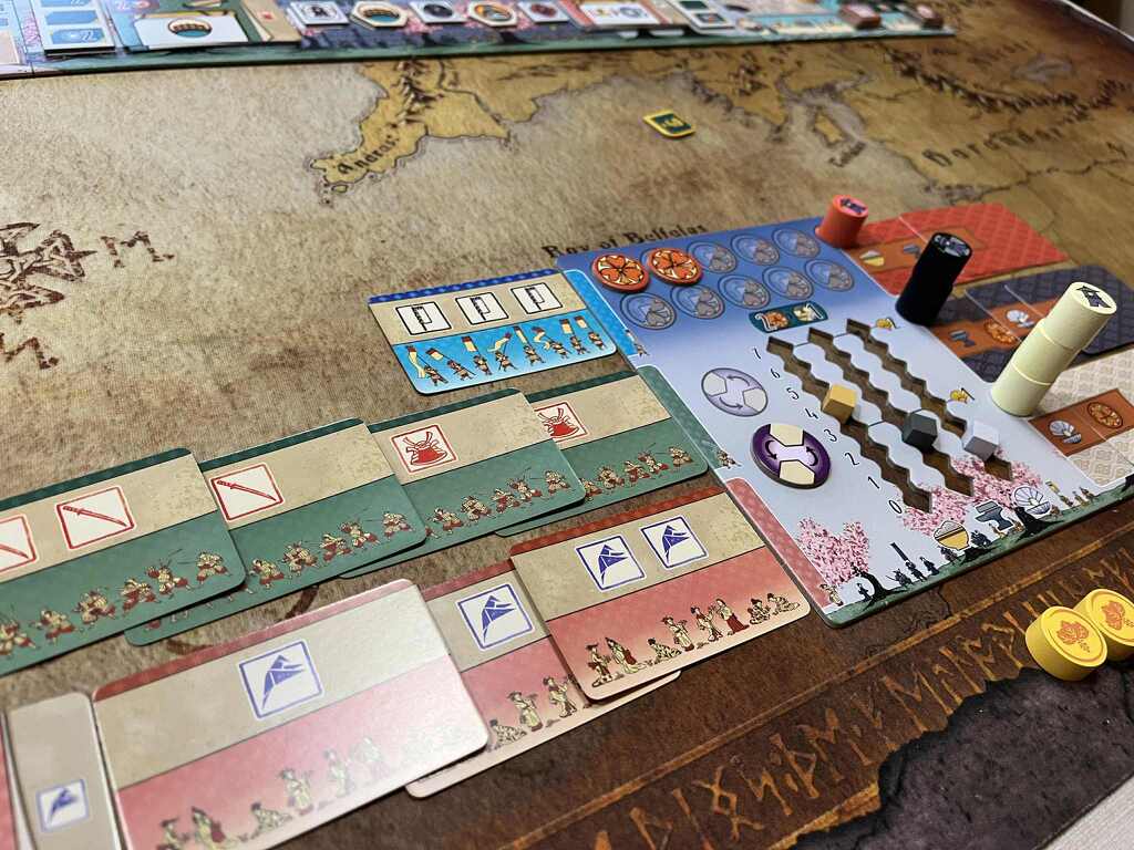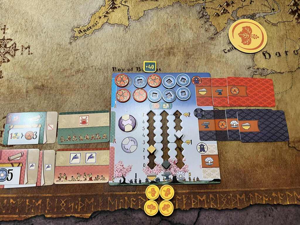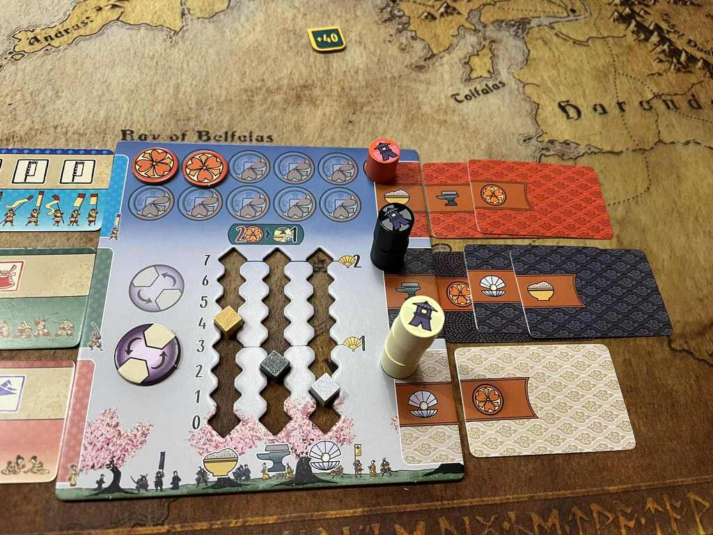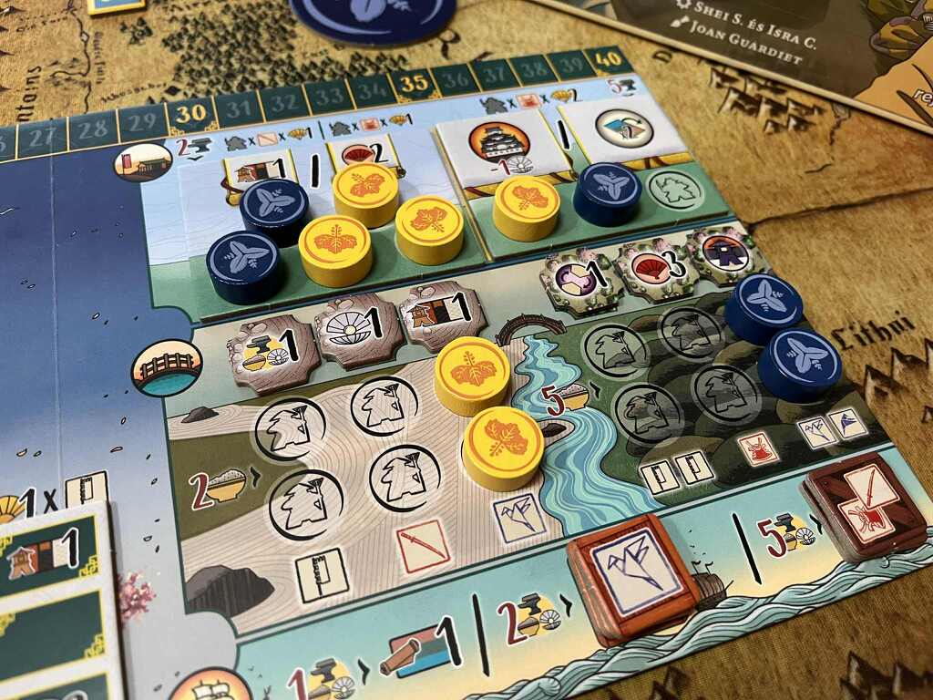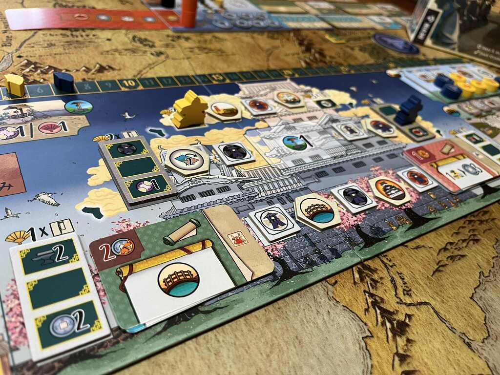 Két típusú kártya van a játékban: a befolyáskártyák, amiket meg kell venni, és a lámpáskártyák, amit egy akció keretében szerezhetünk meg. A befolyáskártyák vásárlásánál mindig a bal felső sarokban látható költséget kell kifizetni, ami daimjópecsét vagy pénz. Ezeken a kártyákon azonnali bónuszok vannak és a birtoktáblánk bal oldalán kell gyűjteni őket. A bónuszokon túl minden kártya bal oldalán találhatóak szimbólumok, mint az origami, Nobori zászló, katana vagy kabutók. Ezek azt jelzik, hogyha a fejlesztés akció segítségével megfordítjuk, akkor azok a szimbólumok lesznek aktívak és láthatóak. Itt jön be a játékba a set collection (szettgyűjtögetés), mert minél több szimbólumunk egy vagy több adott fajtából egy bizonyos feltétel mellett, annál több pontot kapunk a játék végén, de erről majd részletesebben az akcióknál. A lámpáskártyákkártyák ugyanúgy 3 színben elérhetőek, mint a lámpásjelölők, és a megvásárlásukkor, a birtoktáblánk színazonos sora mellé kell őket helyezni. Ezzel elindul egy engine building (motor építés), mert minél több kártyánk van egy adott lámpás sorába, annál több jutalmat zsebelhetünk be, ha aktiváljuk azokat.