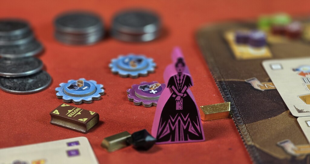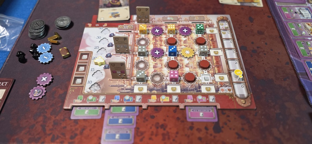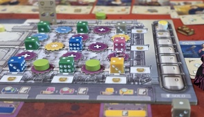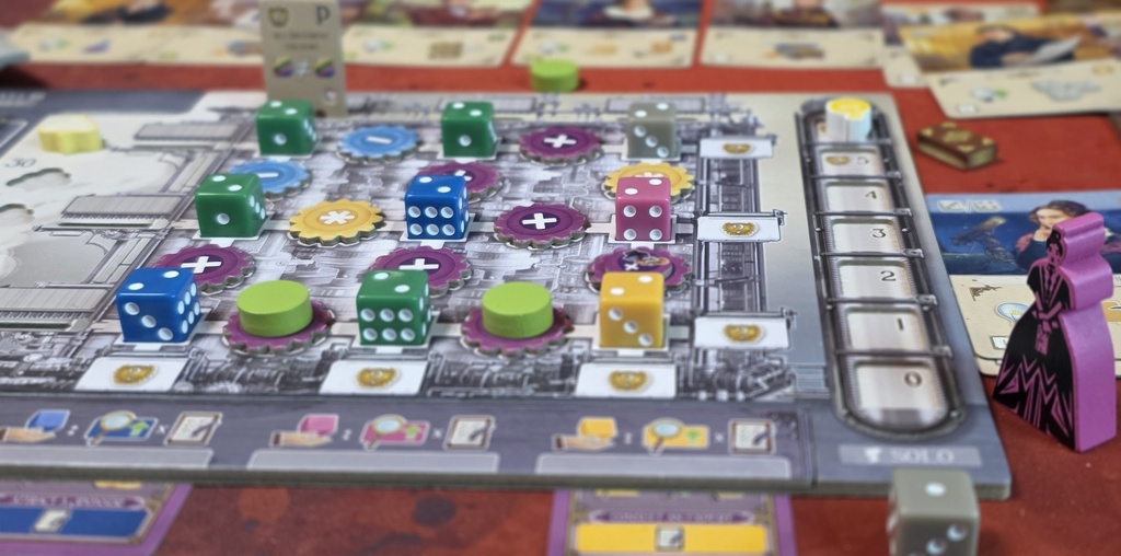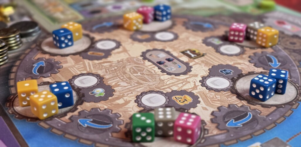 Bár alapvetően nem tudom azt mondani, hogy az Ada’s Dream teljesen egyedi játék, mivel számos eleme máshonnan lett véve, a 2022-es Air Mailről is ismert Toni López mégis egy rendkívül egyedi egyveleget épített fel, amely ráadásul egészen különleges mechanikai csavarokat, vagyis inkább fogaskerekeket tartalmaz. Méghozzá szó szerint. Már az is érdekes ötlet, ahogy a műhelyből szerezzük (a rondelen haladva lökjük bónuszmezőre) az akciókockákat, melyek a színük és értékük alapján további extra jutalmakat eredményeznek. A felhasználásuk pedig még izgalmasabb.
