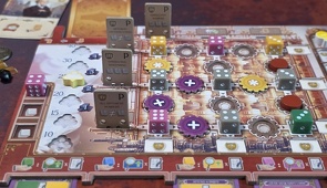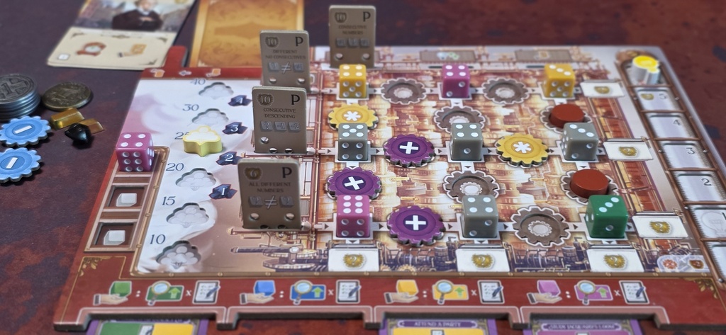 Mert a gépbe építve nemcsak a négy speciális helyszínt és ezáltal főakciót határozzák meg, de a játékosok közben akár többséget is szereznek, szetteket gyűjtenek, mindehhez pedig rengeteg bónusz-szerzési mód kapcsolódik, ahogy a négy területhez tartozó kutatási sávokon is egyre feljebb haladunk. A további bónuszokért, persze. A legfontosabb azonban tényleg maga az analitikus számolómű. Ide tesszük bónuszokért a programkártyákat, de a kockákat és a különböző fogaskerekeket is. Utóbbiak pedig összeadják-kivonják és szorozzák a kockák értékét, hogy a játék végére betelt sorok és oszlopok jelentsék az Ada’s Dream legfőbb pontszerzési módját. Más kérdés, hogy minden, a géppel elérhető pontszám a gépben elért gőzenergiától függ, avagy még arra is figyelni kell. De hogy ez micsoda agyégetős játékmenetet eredményez, kérem szépen! Mert nem maga az Ada’s Dream bonyolult – sőt, a játék minden egyes alapmechanikája abszolút logikus, tematikus és érthető –, hanem az a rengeteg kapcsolódás és átkötés, amely a játékot is éppen úgy keresztbe kasul hálózza át, mint egy analitikus gépet.