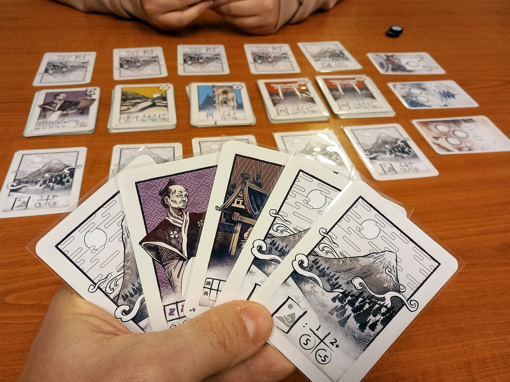 Ez önmagában nem lenne túl izgalmas, de a játék több érdekes megoldást alkalmaz. A Naishi egy klasszikusnak mondható tablóépítő játék, kártyákat helyezünk egymás mellé, amik szomszédosság alapján több-kevesebb pontot érnek. A kártyákat fokozatosan cseréljük le magunk előtt, de a lapok pozíciója kötött. A kétsoros tablónk összesen tíz lapból áll, és a második sorát a kezünkben tartjuk, így ez félig rejtett információ.