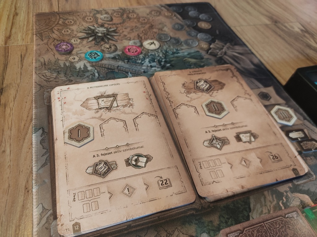 De hol van ebben a witcherkedés? Hol van a változatosság? Hol van az a bizonyos beígért történet, amivel újra játszhatjuk a regények legjobb jeleneteit? Természetesen a könyvek lapjain. Jár ugyanis a játék mellé egy vaskos óriáskártya-köteg. Ez lesz a történetpaklink, amit úgy fogunk majd lapozgatni, mint egy könyvet. Ez ad majd egy történeti keretet az eseményeknek, ez mutatja meg, hogy mik a fejezetben az aktuális, gyűjtögetni való aktív szimbólumok, ahogy azt is, hogy mik lesznek azok a következő fejezetben – attól függően, hogy merre halad a sztori. Minden egyes döntés más irányba tereli a játékosokat, változik tőle a végkimenetel és új szabályok is életbe léphetnek.