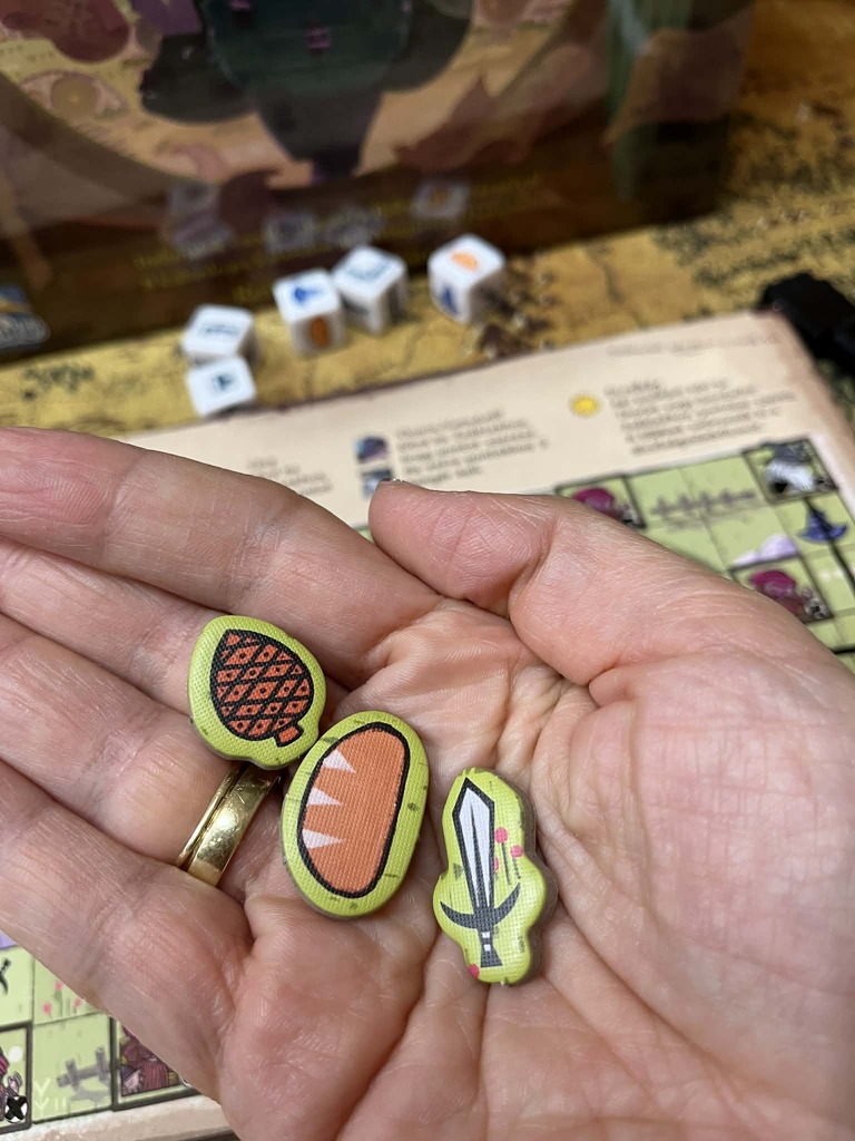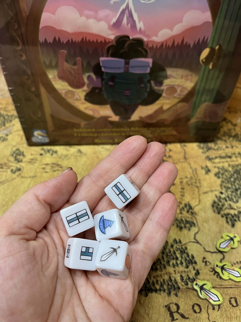 Van két olyan utazáskocka, amelyek segítségével erőforrásokat szerezhetünk. Ezeken kard-, kenyér- vagy kalapszimbólum található. Ezeknek a kockáknak a használatakor – attól függően, hogy melyik kalandot játsszuk – begyűjthetjük a megfelelő jelzőket vagy bejelölhetünk valamit a pontozó lapunkon.