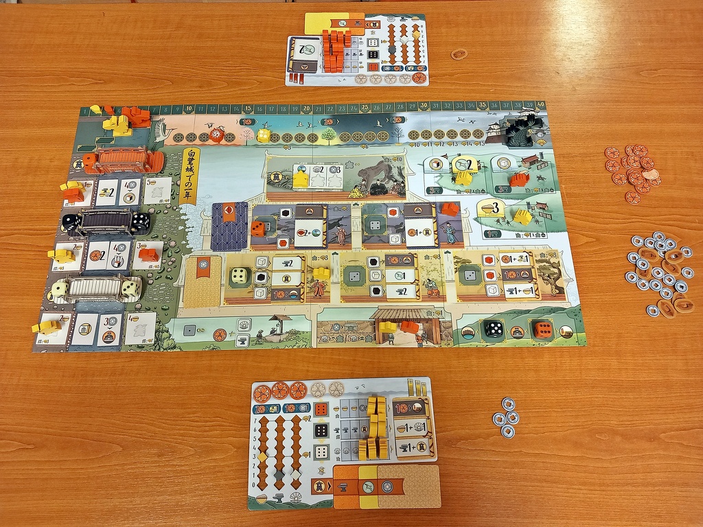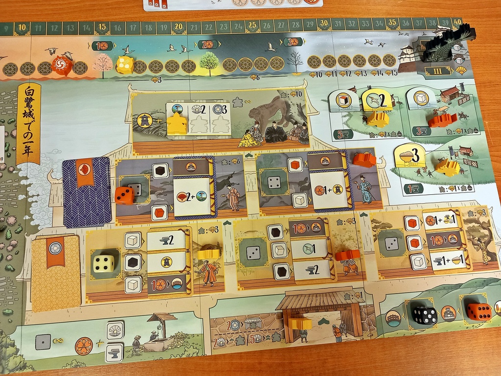 További fontos helyszín a birtoktáblád. Ezen találod a figuráid, az akciókártyád, itt jelölöd az erőforrásokat, és itt gyűjtöd az udvaroncok segítségével lecserélt akciókártyákat is, amivel majd a lámpás akciót tudod fejleszteni. És találsz itt három kockahelyet is. Amikor leveszel egy figurát, felfedsz egy bónuszt. Amikor használod az egyik kockahelyet, akkor az összes felfedett bónuszt, valamint az akciókártya megfelelő sorát is végrehajthatod.