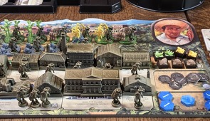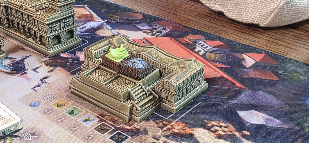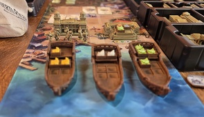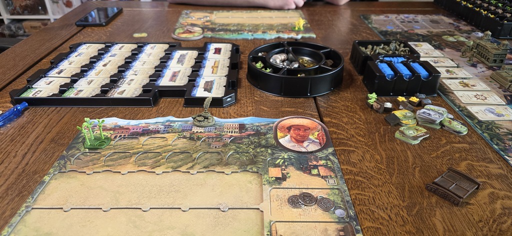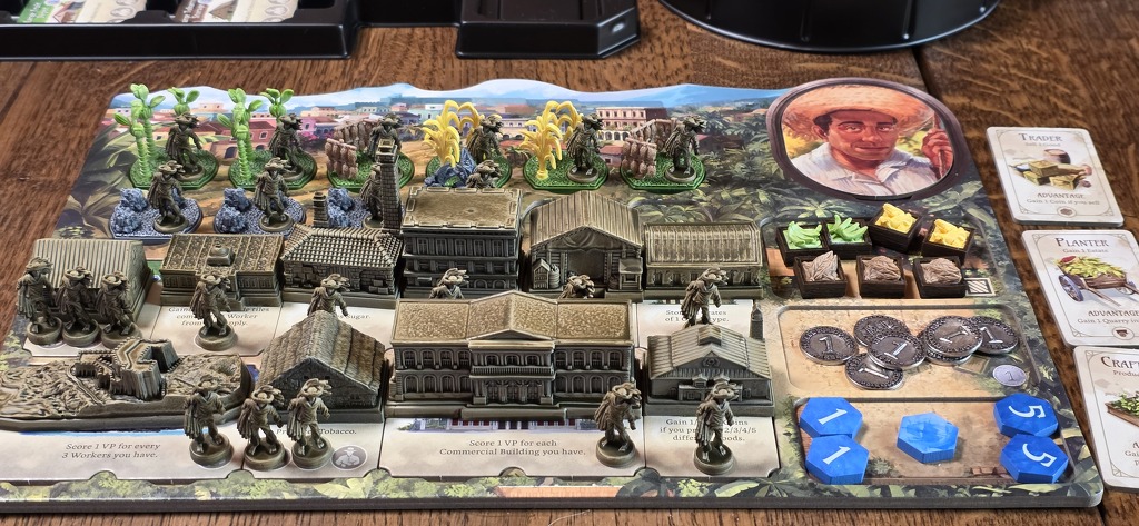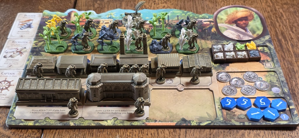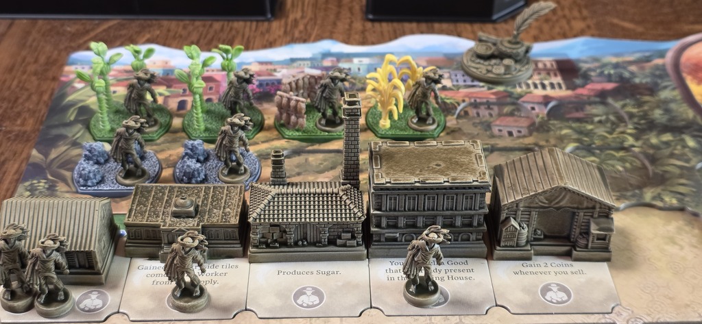 Még a nagy épületek játék végi pontozásához is szükséges a személyzet: az Erőd például minden harmadik saját munkás után ad 1 pontot. Ha azonban nem üzemeltetjük, bukjuk a szép kis pontszámot. Lehetőség tehát bőven van, ahogy a termelés-kereskedés-hajóztatás trióban is, csak ki kell használni, mielőtt elfogynak a munkások / vagy a pontjelölők / vagy valaki betölti az épülethelyeit. Mert ha ezek egyike megtörténik, a forduló végével a játéknak is vége, és jöhet a pontszámlálás.