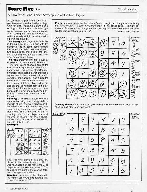 Score Five is played on a 6x6 square grid in which someone has randomly placed the numbers 1-9, four times each. The first player starts by circling the number in one of the four corners and starting a running total with that number. The second player circles an adjacent number and adds it to the running total. This continues until the running total...
