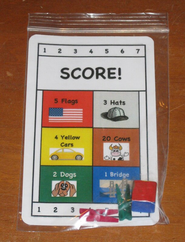 From the designer's Etsy listing (Etsy seller fun4thecar): "This is a travel game I created after many trips with my nieces and members of our youth group. Simply roll the colored die. Match the color rolled on the die to the color on the chart and begin your search! Whoever finds the correct number of items first wins the round. Don't forget to shout...