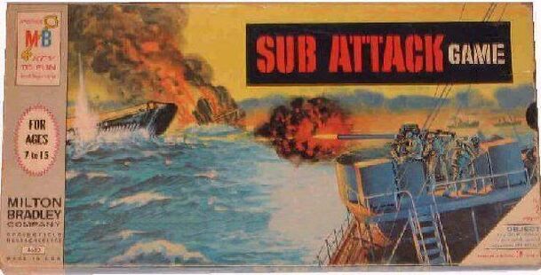 Object of Sub Attack is to either sink enemy ships or get them safely to port depending on which side you are on. The Fleet Commander spins a spinner to possibly move one of his three ships (blue pawns). The Sub Commander draws one card per turn hoping to get a card showing the letter and color where a ship is located. If this happens, the ship is sunk....