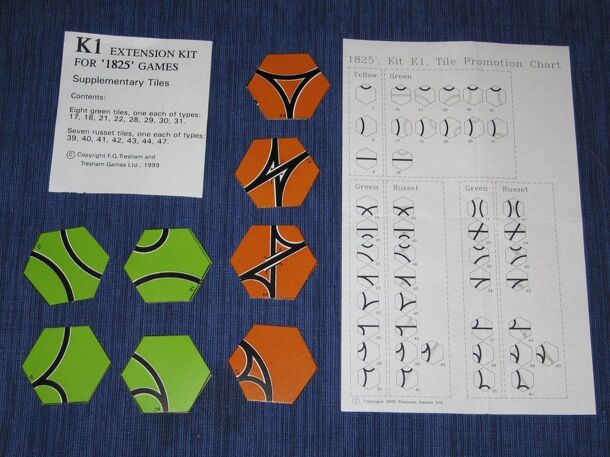Az 1825 Extension Kit K1: Supplementary Tiles egy összetett kiegészítő az 1825 Unit 1 társasjátékhoz, 2 - 5 játékos részére, az átlagos játékidő hosszabb, akár 2 óra is lehet. A társast, a bonyolultsága miatt, csak 14 éves kortól ajánljuk kipróbálni. A játékmenet erősen épít a lapka-elhelyezés és a moduláris tábla mechanizmusokra.