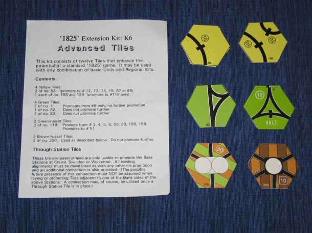 Az 1825 Extension Kit K6: Advanced Tiles egy összetett kiegészítő az 1825 Unit 1 társasjátékhoz, 2 - 5 játékos részére, az átlagos játékidő hosszabb, akár 2 óra is lehet. A társast, a bonyolultsága miatt, csak 14 éves kortól ajánljuk kipróbálni. A játékmenet erősen épít a lapka-elhelyezés és a moduláris tábla mechanizmusokra.