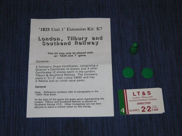 Az 1825 Extension Kit K7: London, Tilbury and Southend Railway egy összetett kiegészítő az 1825 Unit 1 társasjátékhoz, 2 - 5 játékos részére, az átlagos játékidő hosszabb, akár 2 óra is lehet. A társast, a bonyolultsága miatt, csak 14 éves kortól ajánljuk kipróbálni. A játékmenet erősen épít a lapka-elhelyezés és a moduláris tábla mechanizmusokra.