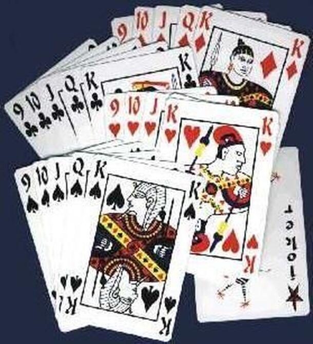 A Nomination Whist variant that is played with an odd deck of cards. The deck contains the four regular suits, but each has 2 Kings, 2 Queens and 3 Jacks, 3 '10's and 3 '9's. There are also four jokers, which count as the highest trump. At the end of each hand, the players score a point for each trick made, with a bonus of ten if you make exactly as many...