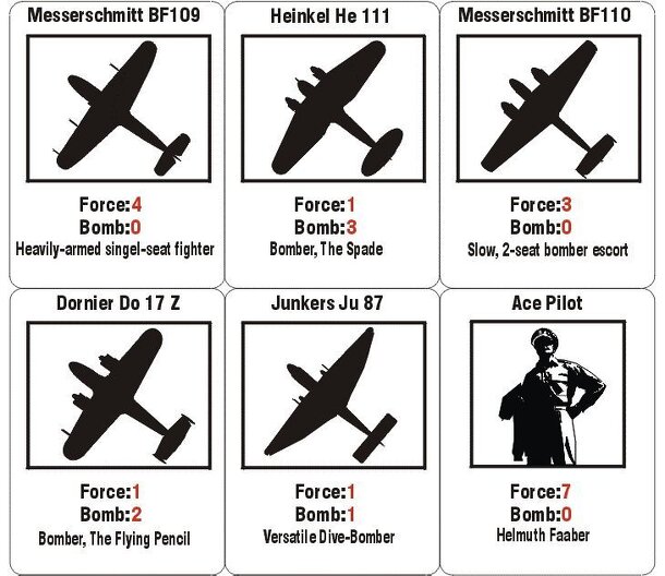 “Card game. Simulates the Battle of Britain. July-September 1940. Players will have to make their own sets of cards. The RAF and Luftwaffe have their own unique decks. Both decks have 62 cards. Notice that most cards have a force value. The Germans also need 20 tokens to represent bomb damage.” Both players start the game with four cards. The players draw...