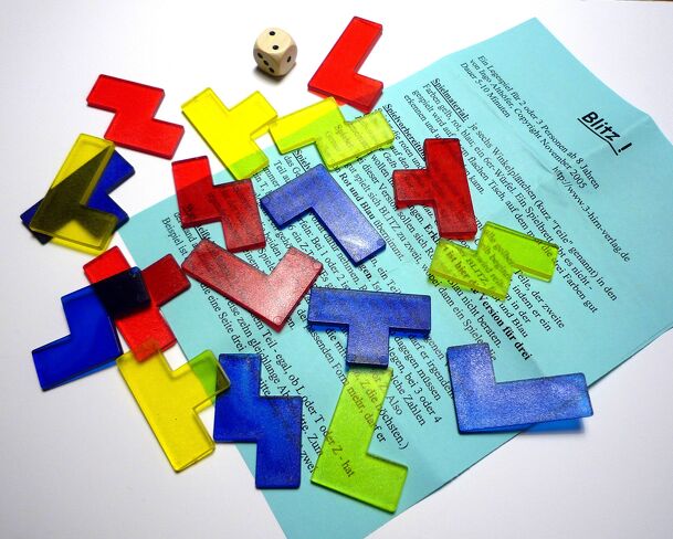 A short game for 2 or 3 players. The game contains of 18 tiles, six of each of three colours: Yellow, red and blue. Each colour is placing a tile alternately. The player paying Yellow can place any of his tiles adjacent to own tiles already placed. Red and blue has to throw the die before placing tiles of their own, determining the form of the tile to be...