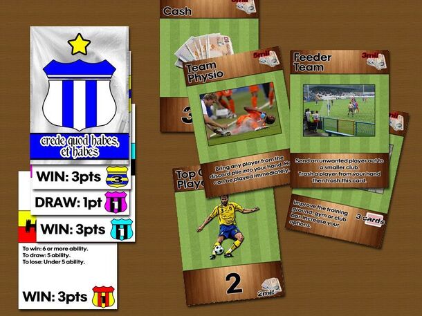 A free Print and Play game ruthlessly taking the deck building mechanism from Dominion, Ascension, Resident Evil etc. However instead of a bleak and bleary fantasy world, players take the roles of football (soccer) team managers and build their club up to challenge for league glory! Buy in squad players, build stadium improvements, get yourself a feeder...