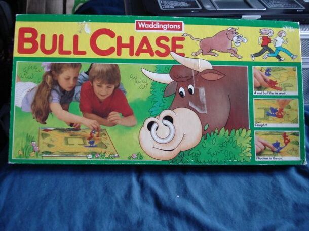 After pitching their tents in the dark, campers awake to find that they have slept in the wrong colored tents! To their horror, they also find they are in a field full of bulls! The campers hurriedly try to reach their own tent to leave for home, but first have to cross the field and avoid the bulls. The pieces are plastic people and the bulls are detailed...