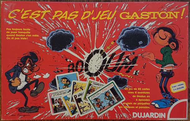 C'est pas d'jeu is a card game set in the "Gaston Lagaffe" comics universe. In the game, each player tries to collect the different parts of short stories of Gaston from a hand of 6 cards. It is also possible to play Boom or Attack cards in other players boards to stop them until they play a Parade card (like in Mille Bornes). Each game round ends when a...