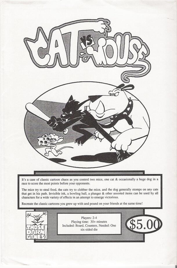 Cat vs. Mouse lets players "Recreate the classic cartoons you grew up with and pound on your friends at the same time!". The game is for 2-4 players and each player gets a "team" of 1 cat and 2 mice. The main object of the game is to get 10 points, mostly by having your mice get food from the refrigerator back into the mouse-hole. The board is the layout...