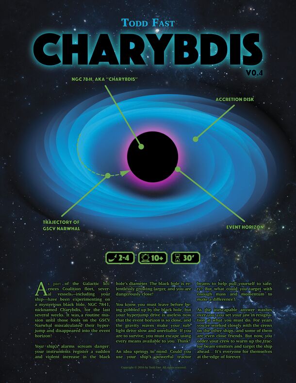 As part of the Galactic Sciences Coalition fleet, several vessels—including your ship—have been experimenting on a mysterious black hole, NGC 7841, nicknamed Charybdis, for the last several weeks. It was a routine mission until those fools on the GSCV Narwhal miscalculated their hyperjump and disappeared into the event horizon! Your ship’s alarms scream...