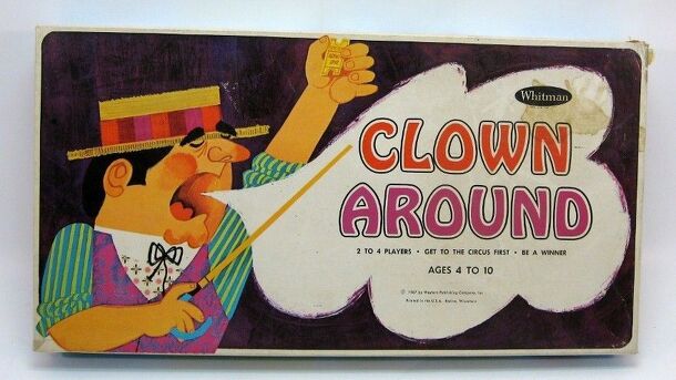The player with the red pawn starts the game. Each player spins and moves the spaces shown by the spinner. When a player stops at as shoe-space the player has to move his pawn up or down the path indicated, while saying: 'Clown Around.' If a player neglets to move his pawn or say 'Clown Around', before the other player moves, the playerloses a turn. At his...