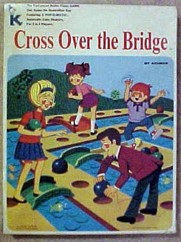 Cross over the bridge is yet another Parchisi-like game, this time requiring players to traverse the board by means of bridges in order to reach the center island. The first player to get all four marbles into the center island wins. Though basically a children's roll-and-move (or "pop-and-move," seeing as how the game comes with two pop-o-matic devices)...