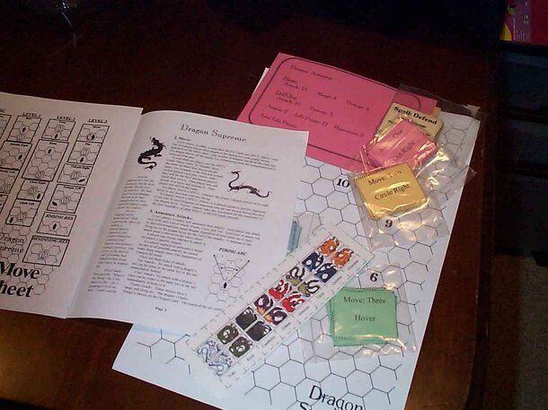 This is a 'dragon dogfighting' game. Each player has a dragon card that lists a unique combination of attributes such as attacks, armor, hit points, and maneuvers. It is played on a plain hex grid, with cardstock hex playing pieces that indicate facing direction. Each turn, all players select a maneuver from a list of those allowed (which depends on the...