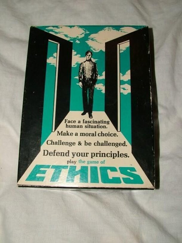 From the manual, "ETHICS is a game of hard ethical choices. As a player, you are projected into situations that range through the spectrum of human experience. Faced with difficult decisions, you must choose a course of action, defend it or modify it and finally, face the judgment of your peers. In setting as different as a supermarket and a concentration...