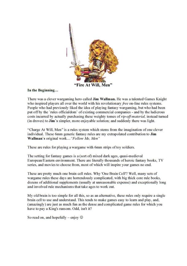 Miniatures rules for fighting mass fantasy battles with 6mm figures. Capsule description from the designer's website: "One Brain Cell Heroic Fantasy Wargame Rules. Designed to be simple, these are fast moving rules involving knights, orcs and mages and all that Don't expect pages and pages of weapons and armour lists, loads of results tables, buckets of...