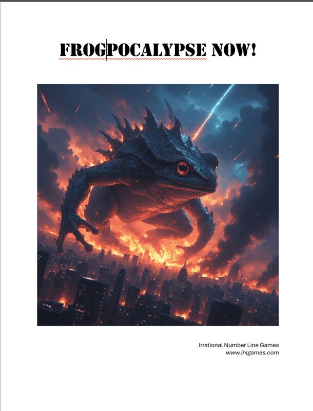 Ancient kaiju? First wave of an alien invasion? Occult harbingers of doom? Science experiment gone wrong? ... Who cares? Frogpocalypse Now! is a tabletop wargame that pits the forces of an imperiled humanity against the worst croakers to squirm out of the muck. Five scenarios are provided for one-off or campaign play. There are variants to tune up or down...