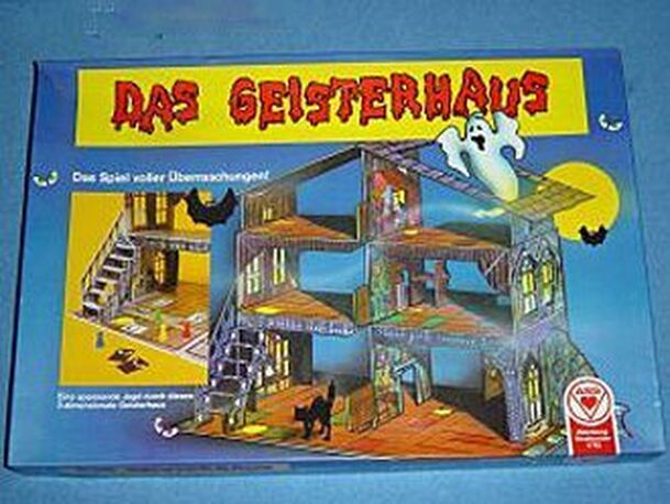 The game board is three-dimensional and depicts a house with three actual floors (stabilized by some clips that hold the house together). Players walk through the house (according to their die rolls). In each room, there are face-down cards. When a card is reached, it can be turned over (secretly). If it shows the color of the player whose turn it is, he...