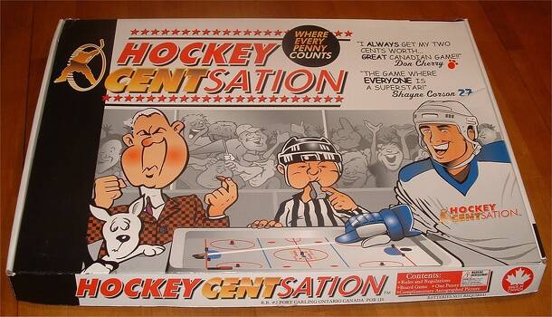 Hockey Centsation is a simple crokinole-style disc-flicking contest. A molded plastic board provides a hockey rink, and a penny is used as the object that the players try to flick into the opposing goal. The players take turns, in each turn taking one flick at the penny, trying to deposit it into the penny-sized hole at the opponent's end of the rink. The...