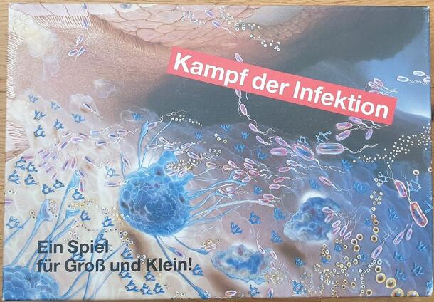 Memory game with dice and piece. The game board is a bronchial mucosa (5x6). The 30 laying cards represent 5 different immunological defense mechanisms. The setting stone is a large round wooden disc. The dice shows 1-3 and three special symbols. Shuffle the cards and place them on the game board. Place the set piece on any square. When it is your turn...