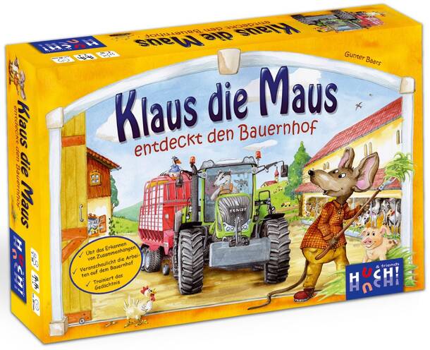 In Klaus die Maus entdeckt den Bauernhof, players visit a farm to see cows grazing on grass, a farmer harvesting apples, and so on. The problem is that to see these happenings they must first assemble small puzzles. The game includes sets of tiles that are divided into different groups. A player uses his memory to find tiles to complete a 2x2 image within...