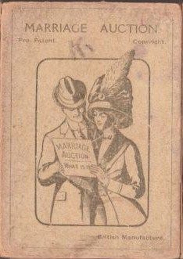 Card game by an unknown publisher, circa 1900. 32 cards in 4 suits of 8. The cards in each suit rank in this order and, if won, they are worth the points noted; Bride 5 points Bridegroom 4 points Best Man 3 points Mother-in-Law 2 points Minister 1 point Bridesmaid A 0 points Bridesmaid B 0 points Bridesmaid C 0 points The suits are called Notes, Gold...