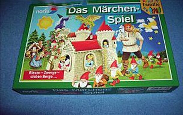 This is a children's game based on the fairy-tales by the Brothers Grimm. It comes with a colorful board, 36 story tiles, 4 player pawns and a six-sided die. The rulebook also contains the nine stories found in the game. Players roll to move their pawns along the track, collecting sets of tiles. From the box cover: Märchenland - "Das Spiel mit 9 berühmten...