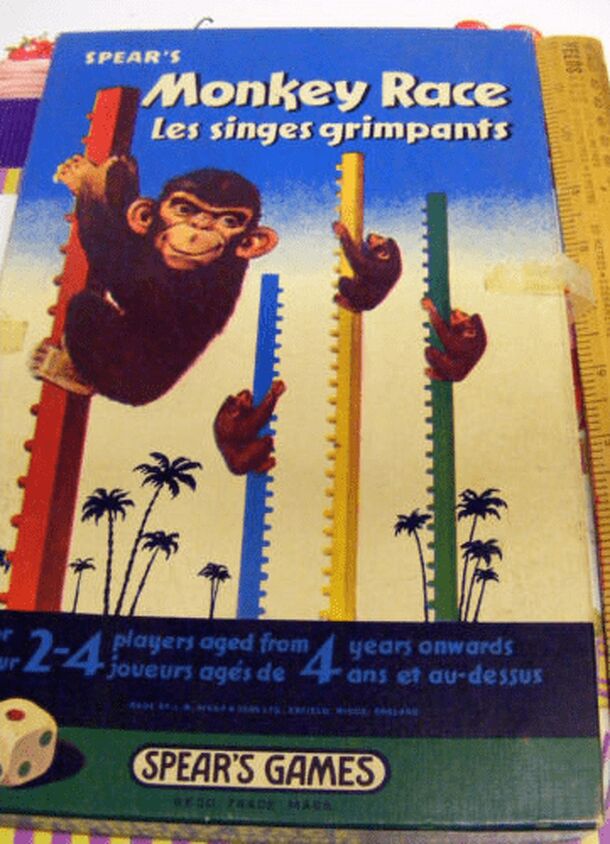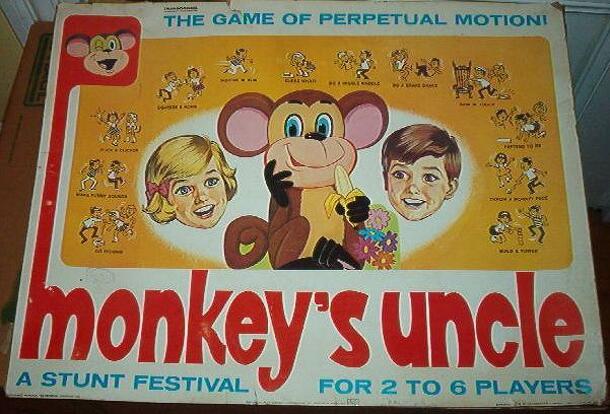 Monkey's Uncle from Transogram uses a timer, a spinner and a series of mats that have different tasks that need to be accomplished before the timer runs out. Things like Make a Sound, Build a Tower, Guess Who, Guess What are on cards that are drawn at random and must be accomplished in order to score points. You spin the spinner move to the color mat...