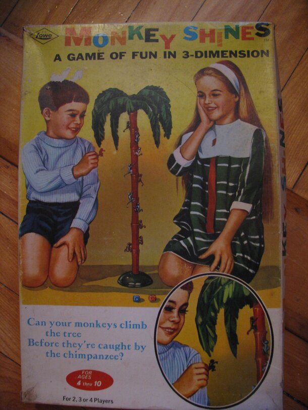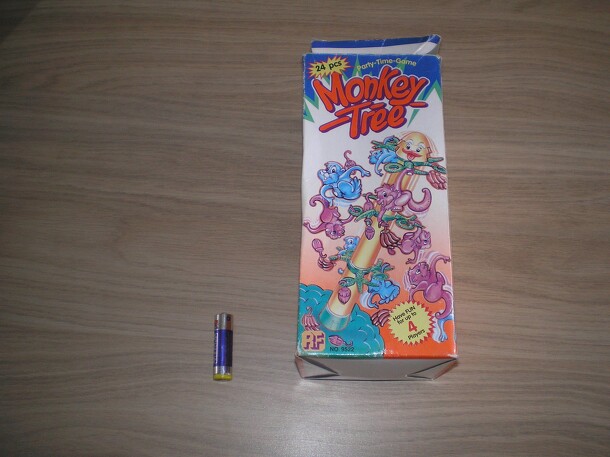 The game centers on a 3-D tree with a plastic trunk and cardboard leaves. Each player gets 3 monkeys in their color (there are 12 monkeys total plus one black chimpanzee figure). Players roll dice to have their monkeys climb the tree via holes in the trunk. If a double is thrown, the player must place the chimpanzee figure a number of holes. Any monkeys...