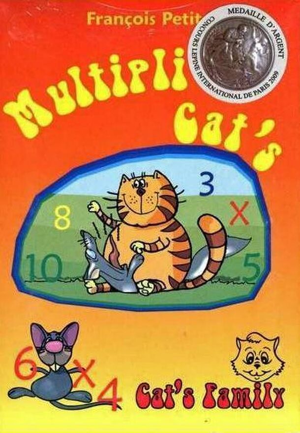 Multipli Cat's is a card game of calculation, memory, concentration and speed. Players take turns turning their cards over and compare their results. If 2 players have the same result (for instance 4 x 9 and 36), they must hit the mouse card placed in the center of the table (green card) as fast as possible. The quickest gives his cards to his opponent....
