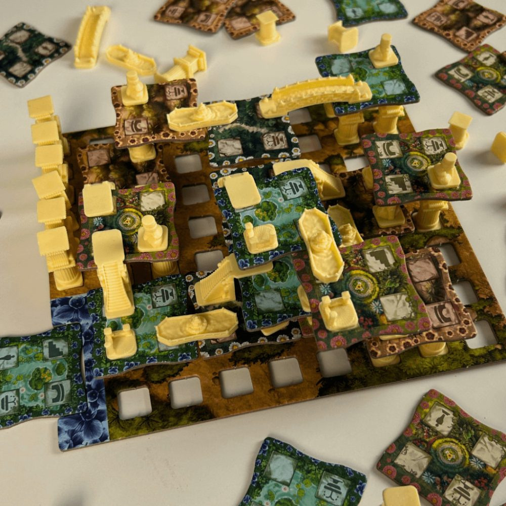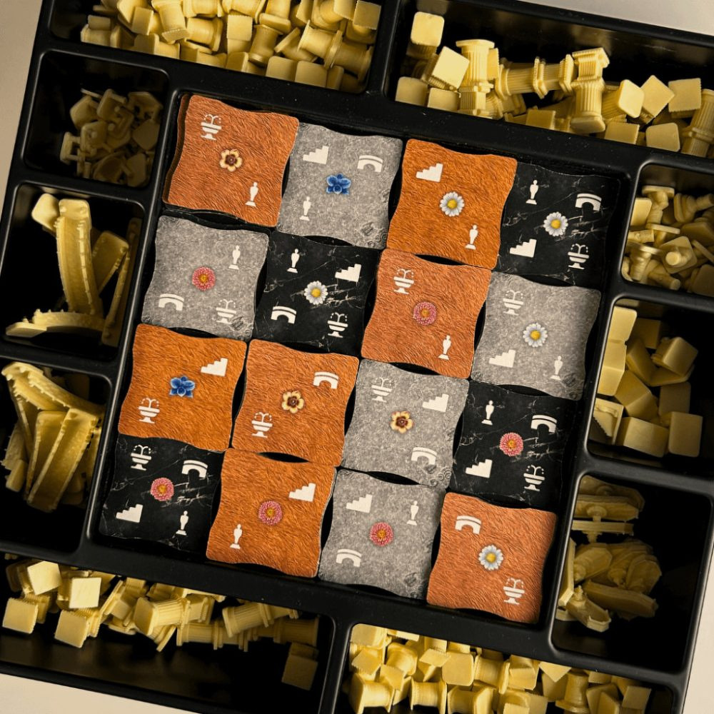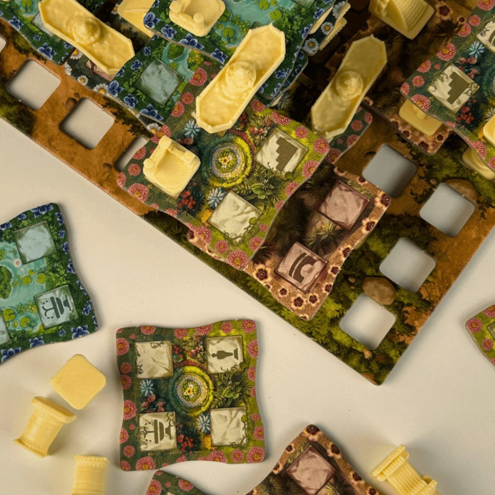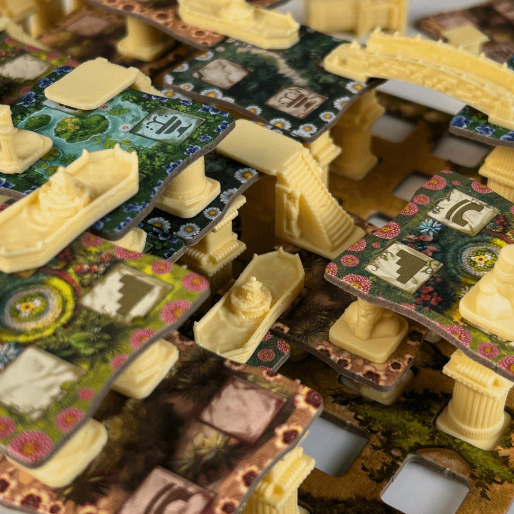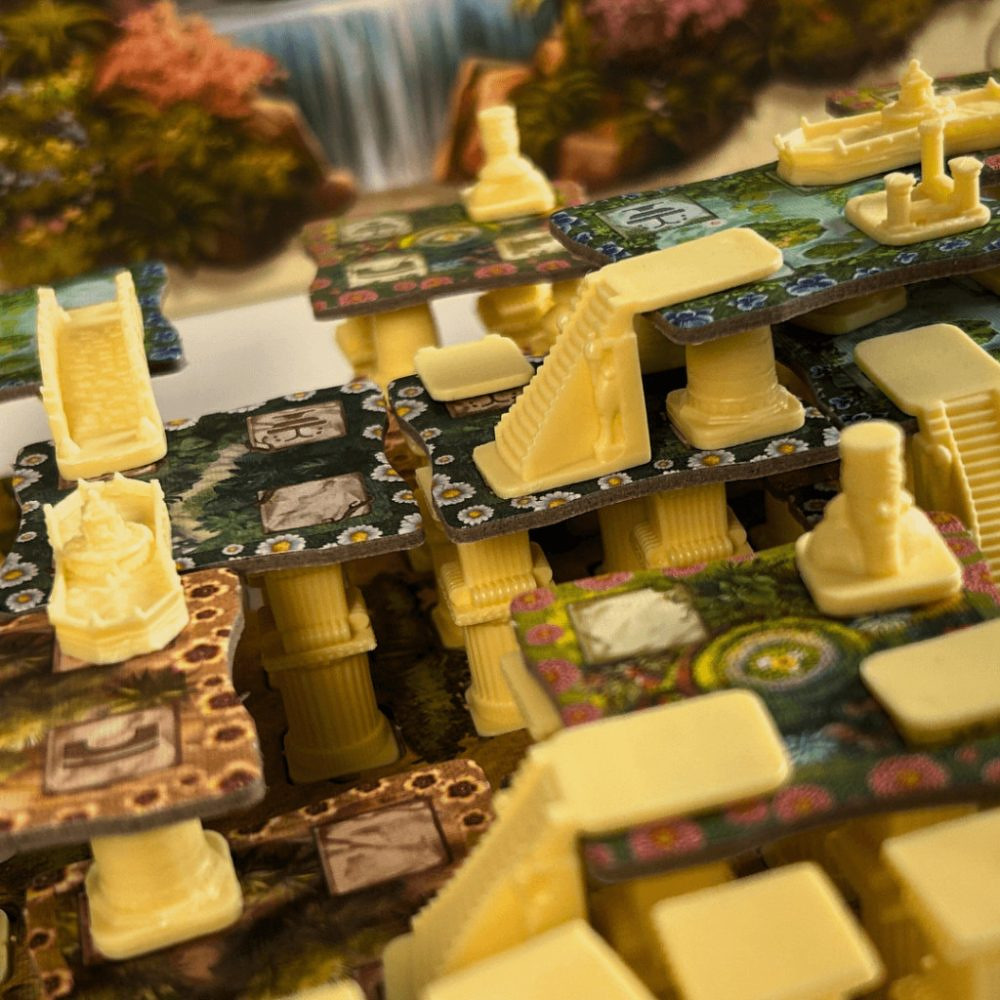✔️ A játék gyönyörű. Elég csak megnézni a képeket, iszonyat látványosak ezek a mini kertek. Az építkezés nem nehéz, mindössze pár szabályt kell csak betartani, úgyhogy igen változatos építményeket lehet összehozni. A játékosok az oszlopok és a teraszok helyét határozzák meg, utána a lapkákon szereplő ikonok együttállásától függően rakhatnak le díszítő elemeket, amik pontot adnak. Azért nem kell bonyolult kombókra gondolni, ráadásul abszolút adja magát. Például a lépcső esetében egymás mellett legyenek az ikonok, de szintkülönbséggel. A hídhoz legyenek egy szinten az ikonok és legyen köztük rés. A játék azt pontozza, ha minél változatosabban és minél magasabbra építkezünk. Szóval tulajdonképpen rá vagyunk kényszerítve, hogy ne csak egy fajta ikonra álljunk rá. Vannak benne tokenek, amiket fordulónkként húzunk és valamilyen bónuszt adnak. Teljesen okés módszer, hogy kicsit változatosabb legyen játék. Sőt, inkább elengedhetetlen.