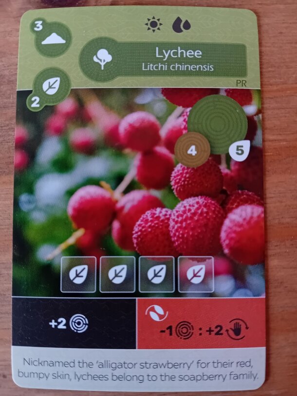 Available from the Tantrum House Season 11 Kickstarter. Soil cost: 3 Base VP: 2 Type: Tree Habitat: Sunny, Wet Name: Lychee Max Growth: 4 Canopy VP: 5 Sprout: 4 First Ability:...