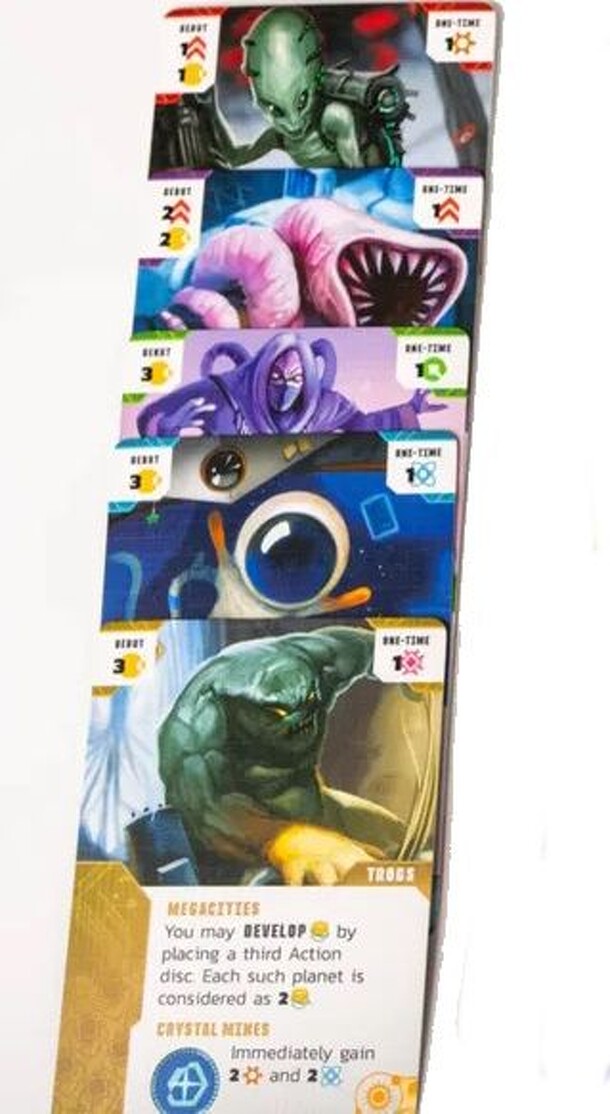 This promo was added to preorders of the game and contains 5 promo factions. So far only one faction as been revealed, but it looked like they belong all to one of the 5 different Ideologies: Faction Name: Trogs Ideology: Industrial Faction Bonus: 3 Credits Abilities: 1. When you develop you may instead place a third disc on one of your already developed...