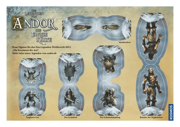 A punchboard promo for Legends of Andor, part of the 2023 Fan Legend Competition. Available for download and home printing on the Andor website and produced only in a very limited quantity. It shows five new figures for Legends of Andor – The Eternal Frost: Die Mondseehexe, Der Tanghorn-Gor, der Grauskral, der Schattenhäuptling und Banator der...