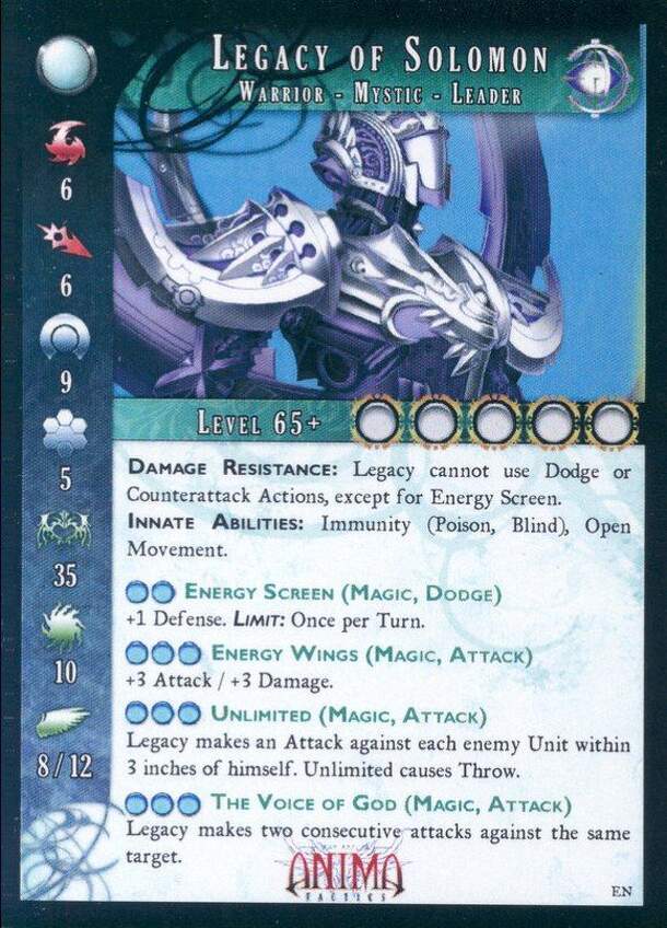 Az Anima Tactics: Legacy Of Solomon egy közepesen összetett kiegészítő az Anima Tactics társasjátékhoz, 2 játékos részére, az átlagos játékidő rövidebb, csak 1 óra. A társast, a bonyolultsága miatt, csak 12 éves kortól ajánljuk kipróbálni. A játékmenet erősen épít az akció pontok és a kockadobás mechanizmusokra.