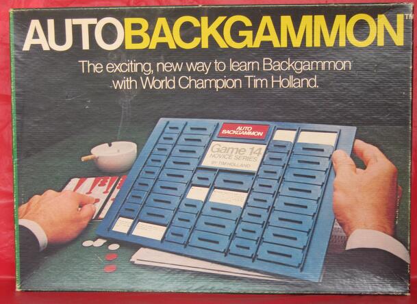 This solitaire game was created to cash in on the craze. Sixty pre-programmed games have been divided into four courses of fifteen games. Place one of the games into the tray. Using the slides in the frame of the tray, the player only sees one move at a time. After sizing up any given situation, the player advances a slide to see what backgammon champion Tim Holland would have done.